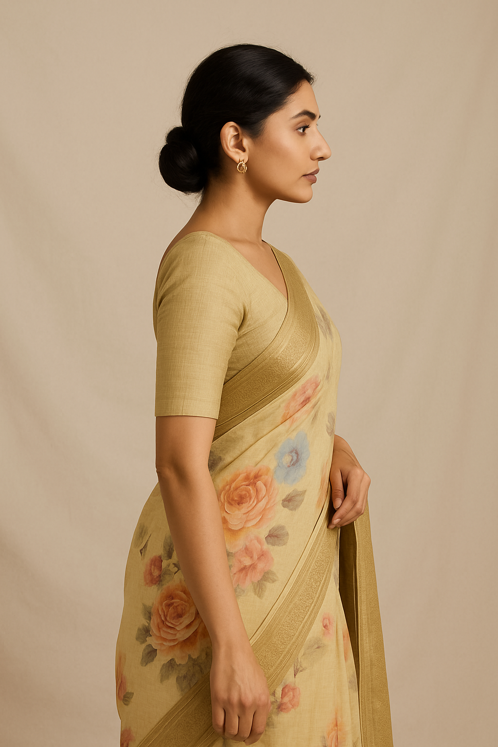 Elegant Beige Floral Linen Blend Saree with Golden Zari Border & Blouse Piece