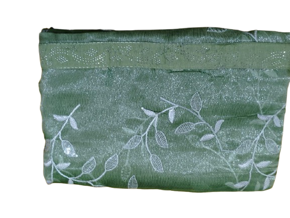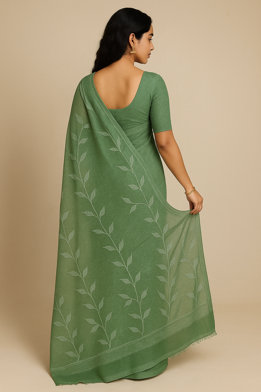 Elegant green saree with soft shine and beautiful silver leaf embroidery. Lightweight, comfortable and perfect for festive wear, functions, or daily elegance.