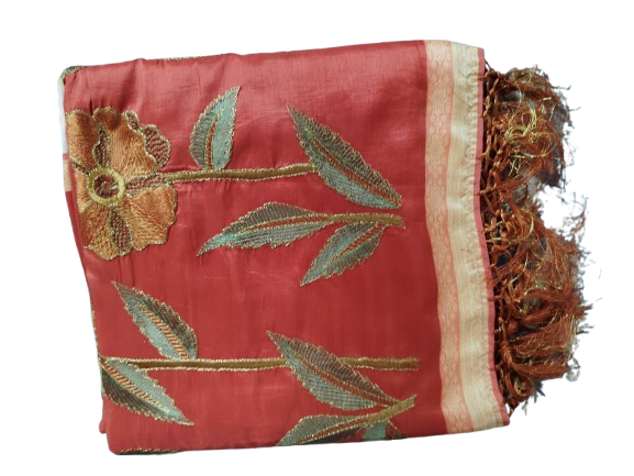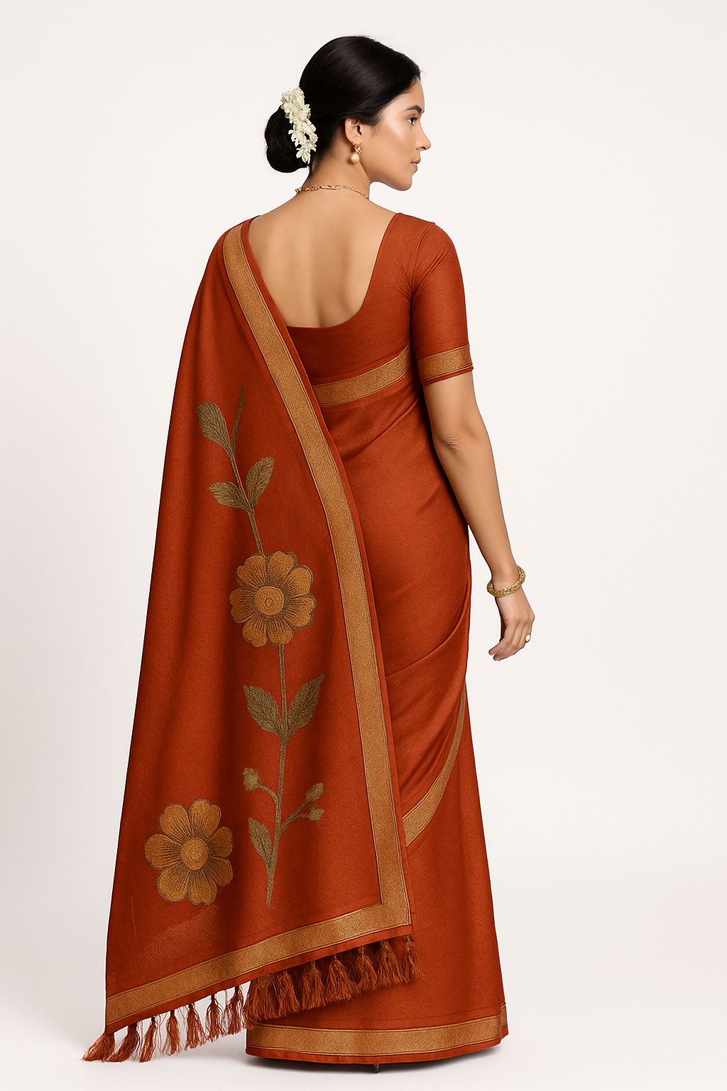 This elegant rust-colored saree features detailed floral embroidery and a rich golden border that adds a touch of luxury. The lightweight fabric drapes beautifully and suits festive events, weddings and traditional functions. Paired with a matching blouse, this saree offers both style and comfort for all-day wear.