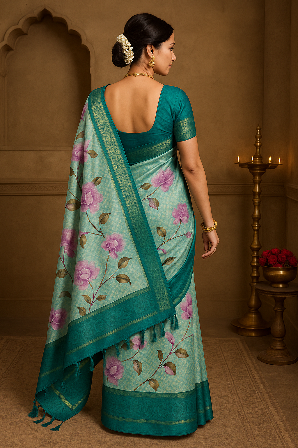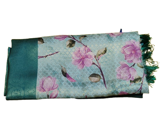 Beautiful soft silk saree with teal border and pink floral print.