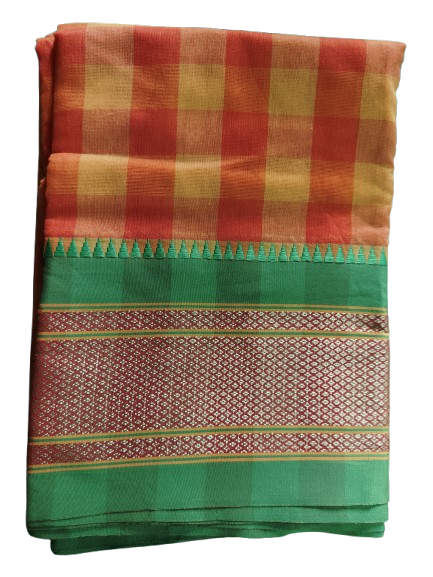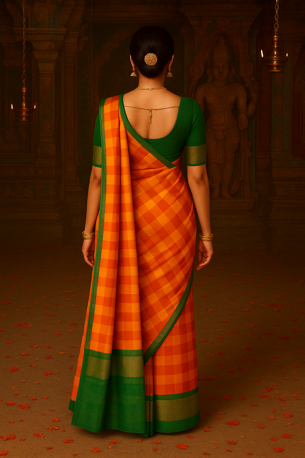 Beautiful South Indian–style silk blend saree in bright orange and yellow checks with a rich green zari border. Paired with a matching green blouse piece, this saree gives a classic festive and temple look.